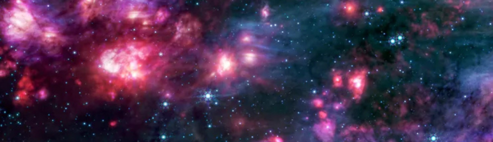 In this James Webb telescope photo the mega molecular cloud near our galaxy center appears as canvas of pink and purple clouds set against shadow backdrop.